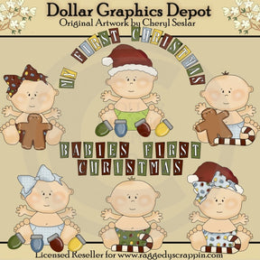 This collection includes three baby girls and three baby boys, wearing checkered, gingham, and Christmas light diaper covers, hair bows, and red Santa hats, little gingerbread men, candy canes, Christmas lights, and two word art graphics - "My First Christmas," and "Babies First Christmas." Colors include: red, green, blue, yellow, brown, and white. This set contains 8 graphics.
