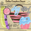 This collection includes colorful socks, a pink and brown zebra purse, a frosted cupcake with sprinkles, one "Sweet 16" word art graphic, and two "My Girl" word art graphics. This set contains 6 graphics.