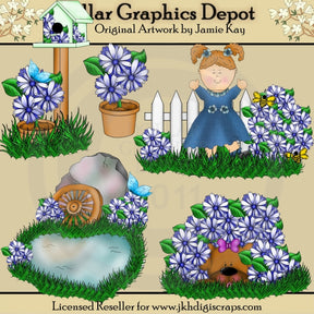 This collection includes a beautiful painted mailbox with a purple daisy plant, green grass, and a blue butterfly, a clay pot filled with purple daisies, a little girl standing in the grass next to a white picket fence, beautiful spring daisies, and fluffy little bumble bees, a pretty meadow with a large boulder, wooden wagon wheel, pretty pond, a blue butterfly, and beautiful spring daisies, and a cute little puppy dog lying in the grass, peeking out of a purple daisy bush. This set contains 5 graphics.