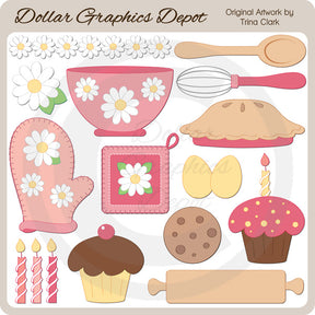 This collection includes a wooden spoon, a whisk, a mixing bowl, a fresh baked pie, an oven mitt, a potholder, eggs, a pretty flower, a chocolate chip cookie, frosted cupcakes, a rolling pin, candles, and a floral divider / border. This set contains 14 graphics.
