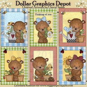This collection includes six 5 x 7 "Baxter and Bailey Spring Blooms" card fronts, with adorable little teddy bears, pretty hair bows, painted watering cans, beautiful spring flowers, clay flower pots filled with spring blooms, strawberry plants, and a pretty sunflower, cute little snails, bumble bees, lady bugs, a pretty blue bird, and one card has "Thinking of You" word art. Patterns include: polka dots, plaid, and gingham. Colors include: red, green, yellow, blue, gray, brown, tan, black, and white. This set contains 6 cards.