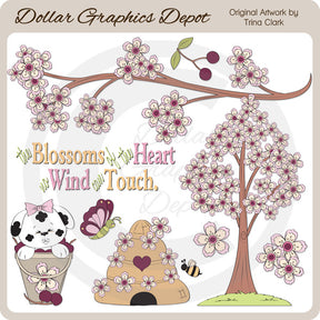 This collection includes a beautiful cherry blossom tree, a cherry blossom branch, cherry blossoms, a butterfly, cherries, a beehive with cherry blossoms and a bumble bee, a spotted puppy sitting in a bucket of cherries, and one "The Blossoms Of The Heart No Wind Can Touch." PLEASE NOTE: This set coordinates with the "Blossoms Of The Heart - Scrap Papers" collection. This set contains 9 graphics.