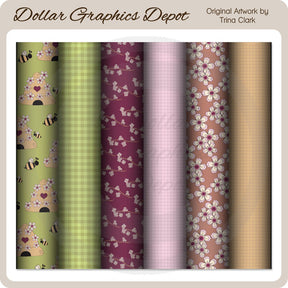 This collection includes six 12" x 12" "Blossoms Of The Heart" scrap papers. Patterns include: beehives with cherry blossoms and bumble bees, gingham, cherry blossoms, and checkers.PLEASE NOTE: This set coordinates with the "Blossoms Of The Heart" graphic collection. This set contains 6 scrapbook papers.