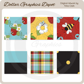 This collection includes six 1" x 1" bugs and berries background tiles with strawberries, pretty flowers, and bumble bees, strawberries, pretty flowers, and butterflies, bumble bees and butterflies, thick stripes, plaid, and polka dots. PLEASE NOTE: This set coordinates with the "Bugs and Berries - Clip Art," "Bugs and Berries - Scrap Papers," and "Bugs and Berries - Digital Stamps" collections. This set contains 6 background tiles.