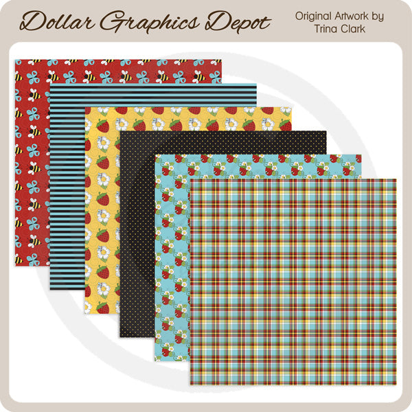 This collection includes six 12" x 12" bugs and berries scrap papers. Patterns include: butterflies and bumble bees, stripes, strawberries and flowers (2), polka dots, and gingham patterns. PLEASE NOTE: This set coordinates with the "Bugs and Berries - Clip Art," "Bugs and Berries - Digital Stamps," and "Bugs and Berries - Background Tiles" collections. This set contains 6 scrapbook papers.