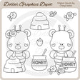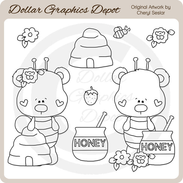 This collection includes adorable bumble bee bears, beehives, pots of honey with honey stirrers, pretty flowers, a strawberry, and a little bumble bee. PLEASE NOTE: This set coordinates with the "Honey Bear - Clip Art" collection. This set contains 8 digital stamps.