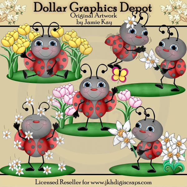 This collection includes six adorable ladybugs, with cute little smiley faces, patches of grass, pink tulips, yellow tulips, white and yellow daffodils, and a little butterfly. This set contains 5 graphics.