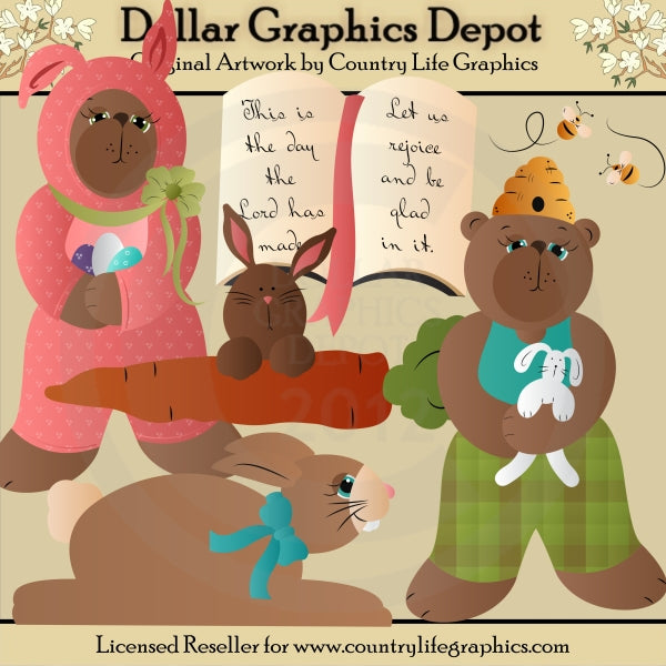 This collection includes an adorable little girl bear, dressed in a pink bunny suit, with colored Easter eggs, a cute little boy bear, dressed in plaid pants and a T-shirt, with a beehive, buzzing bees, and a little bunny rabbit, a little bunny rabbit holding onto a carrot, a little bunny rabbit lying down, and a Bible with the pages open to the following scripture: "This Is The Day The Lord Has Made; Let Us Rejoice And Be Glad In It" (Psalm 118:24). This set contains 5 graphics.