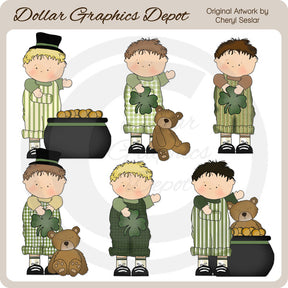 This collection includes six adorable little boys wearing overalls, long sleeve shirts, and St. Patrick's Day hats, shamrocks, pots of gold, and cute little stuffed teddy bears. Colors include: green, white, tan, brown, cream, black, and gold. This set contains 6 graphics.