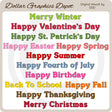 This one-of-a-kind collection is only available at Digital Craft Supplies. This large set includes twelve, colorful, monthly word art graphics - "Merry Winter," "Happy Valentine's Day," "Happy St. Patrick's Day," "Happy Easter," "Happy Spring," "Happy Summer," "Happy Fourth of July," "Happy Birthday," "Happy Fall," "Back To School," "Happy Thanksgiving," and "Merry Christmas." This collection was created to coordinate with the monthly colors of the "Calendar Bears - Clip Art - DCS Exclusive collection, but it certainly can be used in any creative work. This exclusive set contains 12 graphics.