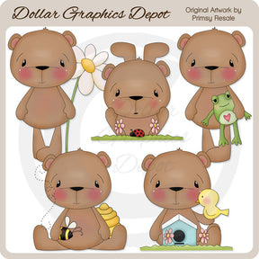 This collection includes adorable summer bears with patches of grass, a pretty daisy, little pink flowers, a ladybug, a frog, a bumble bee, a beehive, a painted birdhouse, and a little bird. This set contains 5 graphics.