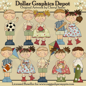 This one-of-a-kind collection is only available at Digital Craft Supplies. This set includes little boys and girls enjoying the summer days with a soccer ball, watermelon slices, baseball, baseball bat, baseball mitt, football, kites, a doll, and a skateboard. This exclusive set contains 8 graphics.