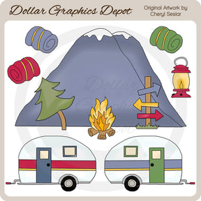 This collection includes two teardrop trailers, snow capped mountains, a pine tree, sleeping bags, camp signs (for you to customize), a lantern, and a campfire. This set contains 10 graphics.