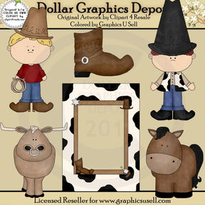 This collection includes a little boy with blue jeans, a red shirt, a cowboy hat, cowboy boots, and a lasso rope, a little boy with blue jeans, a khaki shirt, cowhide vest, cowboy hat, and cowboy boots, a long horned bull, a horse, a brown leather cowboy boot, and one black and white cowhide frame, with brown trim, a sheriff badge, gun, cowboy hat, and cowboy boot. This set contains 6 graphics.