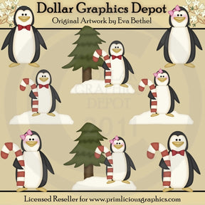 This collection includes eight tuxedo penguins, pink bows, red bows, candy canes, snow, and pine trees. This set contains 8 graphics.