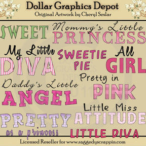 This collection includes ten grungy girl word art graphics in pink, purple, green, black, and white - "Sweet," "Mommy's Little Princess," "My Little Diva," "Sweetie Pie," "All Girl," "Daddy's Little Angel," "Pretty In Pink," "Little Miss Attitude," "Pretty As A Princess," and "Little Diva." This set contains 10 word art graphics.