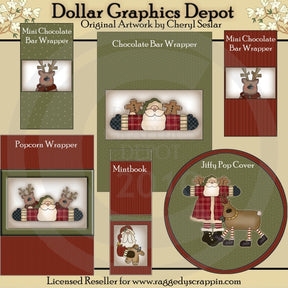 This collection includes six coordinating wrappers with red striped backgrounds, green and tan polka dot backgrounds, sweet Santa Clauses, gingerbread men, and cute little reindeer. This set includes: a large chocolate bar wrapper, two mini chocolate bar wrappers, a mintbook, a popcorn wrapper, and a Jiffy Pop cover. This set contains 6 printables.
