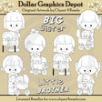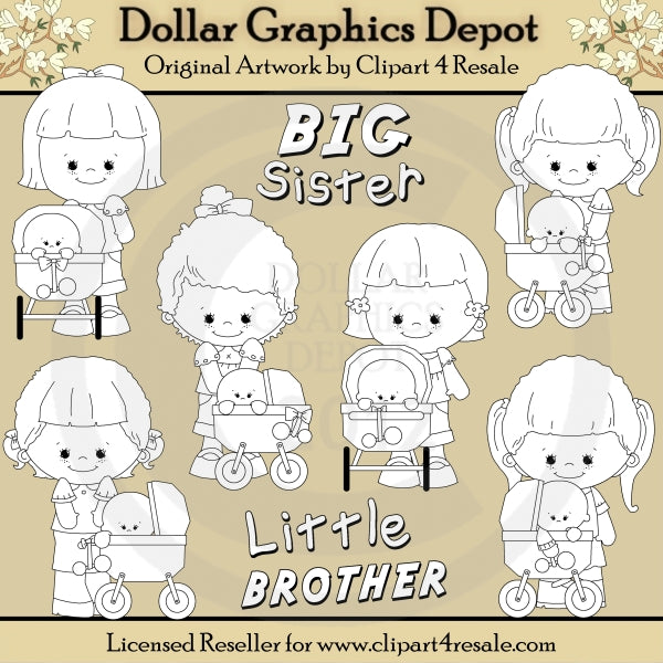 Esta colección única solo está disponible en Digital Craft Supplies. Este conjunto incluye seis hermanas mayores, seis hermanitos en cochecitos de bebé y dos gráficos con palabras: "Hermana mayor" y "Hermano pequeño". Este exclusivo set contiene 8 sellos digitales.
