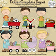 Esta colección incluye niños y niñas pequeños, con carros rojos, ositos de peluche, un balón de fútbol, un balón de fútbol, un auto de juguete, un remolcador, un triciclo rojo, carros rosados, libros de cuentos, carteras pequeñas, una muñeca y un cochecito de bebé morado. Este conjunto contiene 6 gráficos.