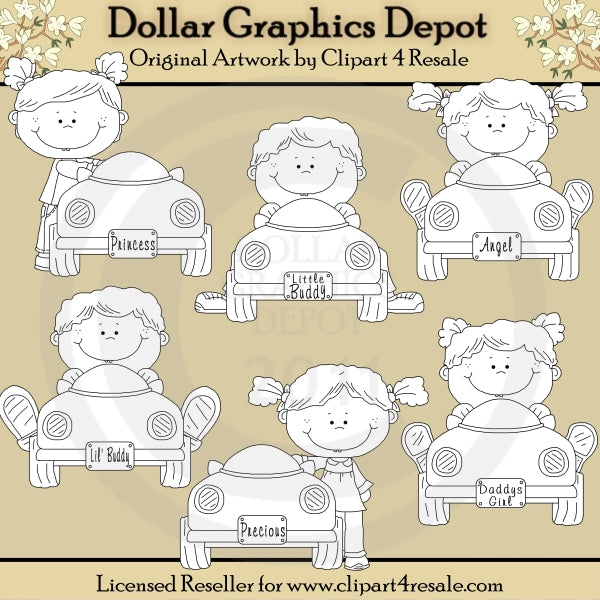 Esta colección única solo está disponible en Digital Craft Supplies. Este conjunto incluye dos niños pequeños, cuatro niñas pequeñas, pequeños autos para niños pequeños y lindos dichos en las placas: "Princesa, Little Buddy, Angel, Lil' Buddy, Precious y Daddy's Girl". Este exclusivo set contiene 6 sellos digitales.