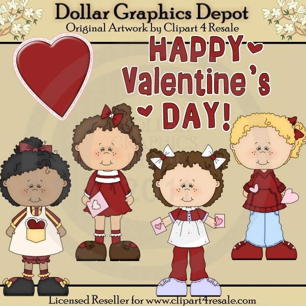 Esta colección incluye cuatro adorables niñas de San Valentín, vestidas con bonitos atuendos y lazos para el cabello a juego, tarjetas de San Valentín con pequeños corazones, un gran corazón rojo de San Valentín y un gráfico con la palabra "Feliz Día de San Valentín". Este conjunto contiene 6 gráficos.