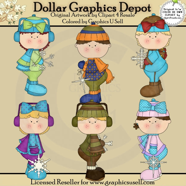 Esta colección incluye seis niños de nieve invernales, vestidos con trajes para la nieve, botas para la nieve, gorros de invierno, manoplas, bufandas y orejeras, cada uno con bonitos copos de nieve. Este conjunto contiene 6 gráficos.