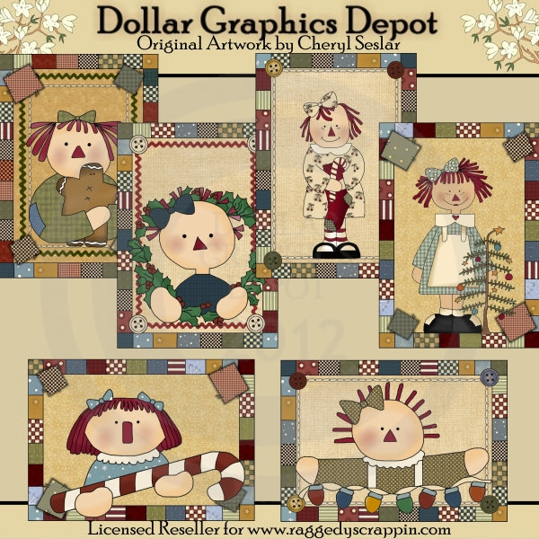 Esta colección incluye seis frentes de tarjetas navideñas remilgadas de Annie, de 5x7, con bordes de patchwork, pequeños trozos de tela, botones, ric rac, puntadas y cinco muñecas de trapo remilgadas: una con un hombre de jengibre, otra con una corona de bayas de acebo y otra con un Calcetín navideño, uno con un árbol de Navidad decorado, otro con un bastón de caramelo y otro con una cadena de luces navideñas. Este conjunto contiene 6 cartas.