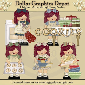 Esta colección única solo está disponible en Digital Craft Supplies. Este juego incluye cinco pequeñas Annies horneando galletas, con sus delantales y bonitos lazos, galletas recién horneadas en una bandeja para hornear, tazones para mezclar, cucharas medidoras, ingredientes para hornear, especias, cuchara de madera, guante de cocina, rodillo, tazón de cerezas y un gráfico de palabras "Cookies". Este conjunto exclusivo contiene 6 gráficos.