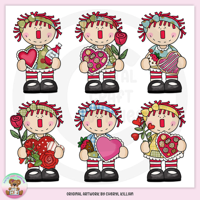 This one-of-a-kind collection is only available at Digital Craft Supplies. This clip art collection includes six country Valentine rag dolls with patchwork dresses and matching headbands, pink and red scalloped Valentine hearts, a bottle of perfume, heart shaped boxes filled with chocolates, red roses, chocolate covered strawberries, a frosted heart shaped cookie, and pretty heart vines. This exclusive set contains 6 graphics.