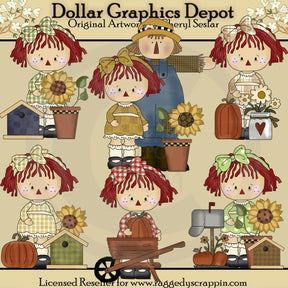 Esta colección incluye seis pequeñas y adorables muñecas de trapo, vestidas con bonitos vestidos de cuadros a cuadros y lunares, y lazos para el cabello a juego, un espantapájaros de otoño, vestidos con un mono de mezclilla azul, una camisa de cuadros de manga larga y un sombrero de paja, calabazas de otoño, bonitas vasijas de barro con girasoles, pajareras pintadas, una carretilla de madera, un tarro de cristal lleno de bonitas flores y un buzón de metal. Este conjunto contiene 6 gráficos.