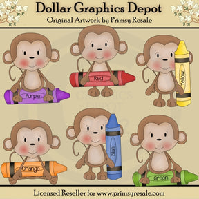 Esta colección incluye seis monos adorables con crayones de colores en morado, rojo, amarillo, naranja, azul y verde. Este conjunto contiene 6 gráficos.