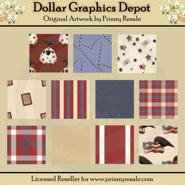 Esta colección incluye once mosaicos de fondo americano con ovejas y cuervos remilgados, corazones cosidos, estrellas patrióticas, corazones enmarcados, banderas y cuervos estadounidenses, rayas, cuadros y patrones vintage sucios. Este conjunto contiene 11 gráficos de mosaicos de fondo. TENGA EN CUENTA: Este conjunto coordina con la colección gráfica "Americana" .