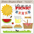 Esta colección incluye una cesta de picnic, un sándwich, una tarta de cerezas, una rodaja de sandía, una fresa, un sándwich, una jarra de limonada, un abejorro, el sol, un trozo de hierba, una hormiguita, un banderín, y un gráfico de palabras "Vamos a hacer un picnic". Este conjunto contiene 13 gráficos.