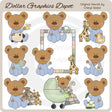 Esta colección incluye adorables ositos con pijamas azules: uno con una oveja de peluche y un chupete, uno con mordedores, otro con una jirafa de peluche y un pato de juguete, uno con un sonajero, uno con un biberón, uno con una oveja de peluche, una jirafa de peluche y una caja llena con un osito de peluche, un biberón y una manta acolchada, uno sentado en un cochecito de bebé con un sonajero y una manta acolchada, otro con un frasco de guisantes, guisantes vainas, una cuchara para bebé y otra con estructura acolchada y una jirafa de peluche. Este conjunto contiene 9 gráficos.