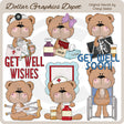 Esta colección incluye ositos adorables, un niño de primeros auxilios, una lámpara de cabeza, un historial del paciente, un estetoscopio, una inyección, un bonito lazo para el cabello, jarabe para la tos, una lata de sopa, una caja de pañuelos, una radiografía, una receta. biberones, muletas, un gorro de enfermera, una silla de ruedas, un marco a juego y dos gráficos con palabras: "Get Well Wishes" y "Get Well Soon". Este conjunto contiene 9 gráficos.