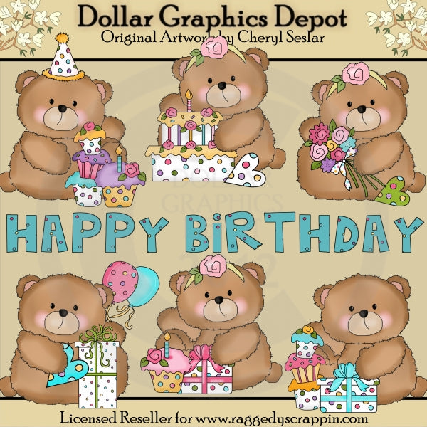 Esta colección incluye seis adorables ositos de cumpleaños, bonitas diademas florales, un sombrero de fiesta, globos de cumpleaños, cupcakes glaseados, bonitos corazones, un pastel de cumpleaños en capas con una vela encima, un ramo de flores, regalos de cumpleaños envueltos con bonitos lazos y un " Gráfico de arte de palabras "Feliz cumpleaños". Este conjunto contiene 7 gráficos.