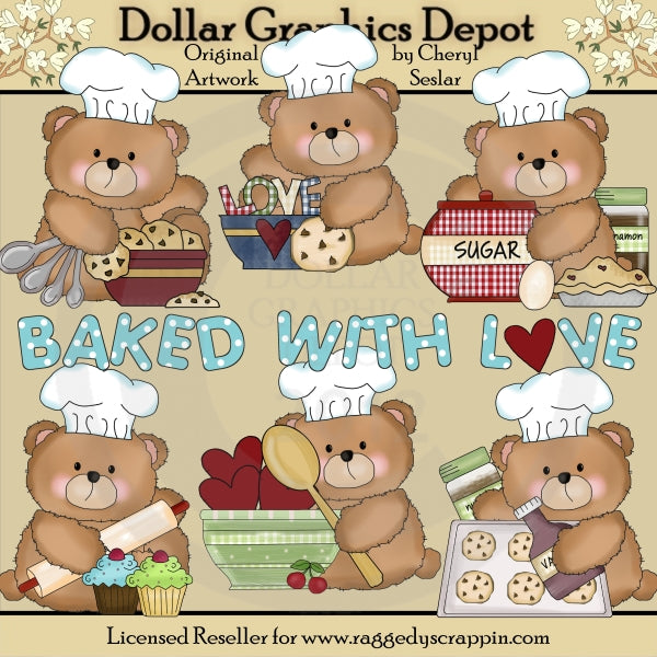 Esta colección incluye seis adorables ositos para hornear, gorros de chef, cucharas medidoras, un tazón lleno de galletas con chispas de chocolate, un tazón con la palabra "Love", una galleta con chispas de chocolate, un bote de azúcar, un huevo, un tarro de canela, un pastel de cerezas recién horneado, un rodillo de madera, pastelitos con glaseado, chispas y cerezas encima, cerezas, un tazón lleno de corazones rojos, una cuchara de madera, un frasco de nuez moscada, una botella de vainilla, una bandeja para hornear llena con galletas con chispas de chocolate y un gráfico con la palabra "Baked With Love". Este conjunto contiene 7 gráficos.