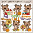 Esta colección incluye seis adorables osos otoñales, coloridas hojas otoñales, calabazas otoñales, una bellota, flores coloridas, un pavo, un girasol, una jarra de sidra de manzana, manzanas rojas y verdes, una canasta de manzanas y tres gráficos de palabras otoñales. "Bendiciones de otoño", "Feliz otoño" y "Bendiciones de otoño". Este conjunto contiene 9 gráficos.