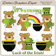 Esta colección incluye seis adorables osos irlandeses con sombreros de duende, tréboles, vasijas de oro, un arco iris con nubes y dos gráficos de palabras irlandesas: "Feliz día de San Patricio" y "Suerte de los irlandeses". Este conjunto contiene 8 gráficos.