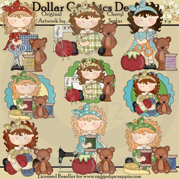 Esta colección incluye seis niñas pequeñas, luciendo bonitos vestidos estampados y diademas a juego, adorables ositos de peluche, tijeras, carretes de hilo de colores, un ovillo con agujas de tejer, telas multicolores, alfileteros de tomate, alfileres de costura, envoltorios de colores. hilo, una aguja de crochet, una cinta métrica, una máquina de coser moderna, una máquina de coser antigua y tres gráficos festoneados a juego. Este conjunto contiene 9 gráficos.