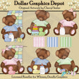 Esta colección incluye seis ositos de peluche andrajosos, vestidos con camisetas y lazos de cuadros vichy, en azul, rosa y verde, bonitas colchas para bebés, patos de goma, biberones, sonajeros para bebés, llaves para la dentición del bebé, anillos para apilar para bebés y tres rayas a juego. antecedentes. Este conjunto contiene 9 gráficos.