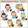 Esta colección incluye siete adorables niñas, vestidas con trajes coloridos y lazos para el cabello a juego, ositos de peluche, patos de goma, globos de fiesta, un sombrero y una varita de princesa, una pequeña corona, una pelota, un cubo lleno de burbujas, una manzana roja, un un par de tijeras, una caja de crayones, un lápiz, una botella de pegamento y una muñequita. Este conjunto contiene 7 gráficos.