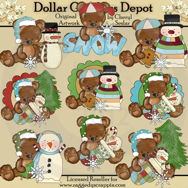 Esta colección incluye seis adorables ositos de peluche, con gorros de invierno y gorras de béisbol, lindos muñecos de nieve vestidos con suéteres de invierno, sombreros de copa, orejeras y bufandas, medias navideñas llenas de mini muñecos de nieve, bastones de caramelo y caramelos de menta, hombres de jengibre, Árboles de Navidad, bonitos copos de nieve invernales, arte de la palabra "Nieve" y tres gráficos festoneados coordinados. Este conjunto contiene 9 gráficos.