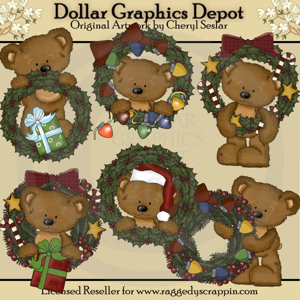 Esta colección incluye seis bonitas coronas navideñas, adorables ositos de peluche, bonitos lazos rojos, bayas de acebo, cadenas de luces navideñas, regalos navideños envueltos, bastones de caramelo, arándanos y estrellas doradas. Este conjunto contiene 6 gráficos.
