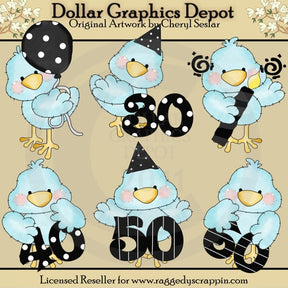 Esta colección incluye seis dulces pajaritos azules, con gorros de fiesta en blanco y negro, un globo de cumpleaños, una vela de cumpleaños, confeti de fiesta y los números de cumpleaños 30, 40, 50 y 60. Este conjunto contiene 6 gráficos.
