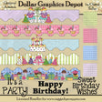 Esta colección única solo está disponible en Digital Craft Supplies. Este juego incluye cinco bordes de cumpleaños festoneados: uno con un fondo de cuadros morado y blanco, regalos de cumpleaños, pastelitos glaseados y sombreros de fiesta, uno con un fondo de rombos rosa y pastelitos glaseados con velas de cumpleaños, uno con un fondo de lunares azul claro y un pastel de cumpleaños en capas con una vela, uno con un fondo de rayas verdes y blancas, un regalo de cumpleaños y sombreros de fiesta, y otro con un fondo de rayas azules y blancas, galletas heladas, conos de helado, pastelitos, helados y sombreros de fiesta. , regalos de cumpleaños y confeti colorido: cuatro fondos de cuadros sucios en verde, rosa, azul y morado, y tres gráficos artísticos con palabras de cumpleaños: "Es una fiesta", "Feliz cumpleaños" y "Dulces deseos de cumpleaños". Este conjunto exclusivo contiene 12 gráficos.