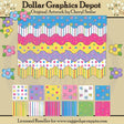 Esta colección incluye siete bordes festoneados, un borde de esquina, doce mosaicos de fondo y cuatro gráficos de flores, cada uno con lunares, rayas y flores, en azul, rosa, amarillo, morado, verde y blanco. Este conjunto contiene 24 gráficos.