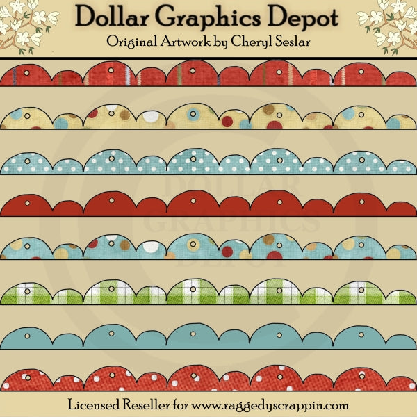 Esta colección incluye ocho bordes festoneados, en bonitos colores navideños, con patrones de cuadros, lisos, rayas y lunares. Este conjunto contiene 8 gráficos.