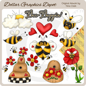 Esta colección incluye adorables abejorros, el sol y las nubes, colmenas, bonitas flores rojas y doradas, un gráfico artístico con palabras "Bee-Boppin'" con corazones rojos y un fondo a juego. TENGA EN CUENTA: Este conjunto coordina con la colección "Bee-Boppin' - Scrap Papers" . Este conjunto contiene 10 gráficos.
