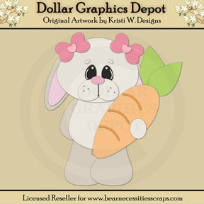 Esta colección única solo está disponible en Digital Craft Supplies. Este conjunto exclusivo incluye archivos de corte que se pueden usar para crear este adorable proyecto de artesanía de Pascua (que se muestra "terminado" en la vista previa): un lindo conejito de Pascua, con lindos lazos rosados para el cabello y una zanahoria fresca.